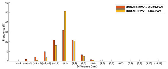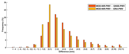 The frequency distribution shown in yellow bars in Figure 7 also indicates the non-normal feature of the differences between ERA-PWV and MOD-NIR-PWV. The frequency of negative differences (about 17%) was significantly lower than that in all of the other ranges, which accounted for over 83% of all the differences. Moreover, about 76% of the differences were concentrated in the range from −1 to 3 mm. These results confirm the considerable systematic overestimation of MOD-NIR-PWV over China.