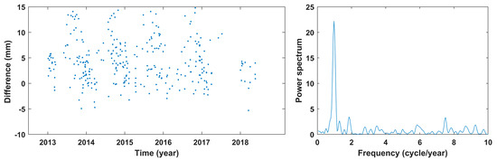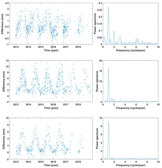 The differences shown in the left column in Figure 11 indicate clear annual and semiannual periodicities at all four grid points, and the periodograms in the right column also illustrate the most notable components in the differences. Based on this characteristic, a harmonic regression model that contained annual and semiannual periodicities and fitted the differences of the two sets of PWV at a given grid point was constructed for the point. The model was: