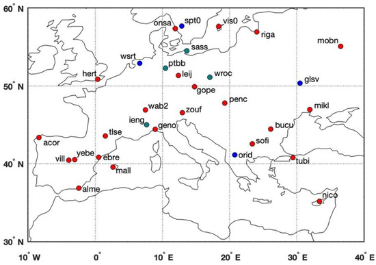 Locations of the selected 31 GPS sites in Europe. The blue dots denote the sites whose vertical displacements are shown in Figure 2, while the green dots denote the sites whose horizontal displacements are shown in Figure 6. Note that the time series at the site glsv are shown in both vertical and horizontal directions (in Figure 2 and Figure 6).