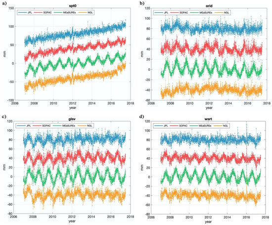 Vertical displacements at (a) spt0, (b) orid, (c) glsv, (d) wsrt (marked with blue dots in Figure 1) from the four GPS time series products. Vertical offsets are added for clarity.
