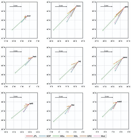 Although GPS horizontal components have been proved to have higher precision than in the vertical direction [35], the load signal in the horizontal direction is only ~30% to 50% of that in the vertical direction [3], which is more difficult to isolate and interpret. Most of the annual amplitudes are less than 1 mm (see Tables S1 and S3), which can hardly reflect the true load signals under the current precision of GPS observation. The only five sites with annual amplitudes larger than 1 mm for all the four GPS series (ieng, sass, wroc for the E direction and glsv, ptbb for the N direction) are selected (marked with green dots in Figure 1), and the SD of their annual amplitudes from the four GPS products are ~0.3 mm, which is about 30% of the observed signal.