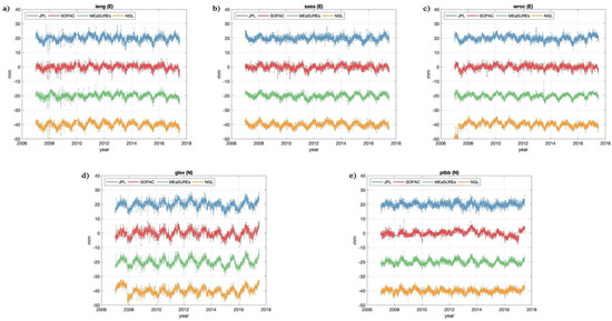 E-direction displacements at (a) ieng, (b) sass, (c) wroc and N-direction displacements at (d) glsv, (e) ptbb (marked with green dots in Figure 1) with all the four GPS time series products (vertical offsets are added for clarity).