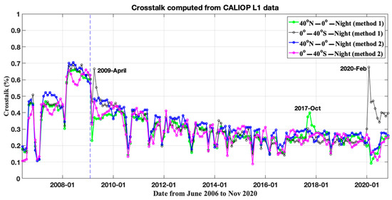 Time series of crosstalk calculated from CALIOP L1 data by methods 1 and 2 from June 2006. to November 2020 over two chosen regions 0°–40° N (green by method 1 and blue by method 2) and 0°–40° S (black by method 1 and pink by method 2). The dashed blue line indicates when CALIOP was switched from the primary laser to the backup laser (i.e., February 2009). The discrete jumps in April 2009, September/October 2017, and February 2020 by method 1 are most likely due to the depolarizing smoke injected into the stratosphere. See details in text.