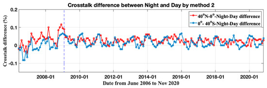 The time series of crosstalk values calculated from level 1 ocean backscattered signals by method 2 from June 2006 to November 2020 over two chosen regions, 0 to 40° N and 0 to 40° S, are shown as blue and pink in Figure 1. The monthly crosstalk values estimated from level 1 ocean backscattered signals (method 2) during nighttime are compared with those estimated by method 1 (green and black in Figure 1). The relative differences of crosstalk values retrieved by method 1 and method 2 are less than 10%, with the root mean square of differences ~0.04%. Figure 2 shows the crosstalk differences between night and day () over two chosen regions 0°–40° N (red) and 0°–40° S (dark blue). The mean difference of crosstalk between day and night shown in Figure 2 is less than 5%, with the root mean square of differences about 0.03%.