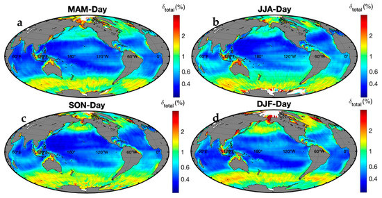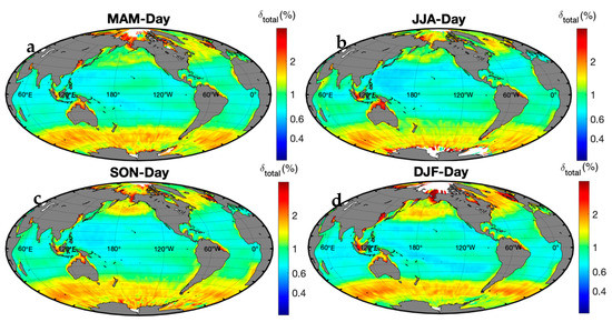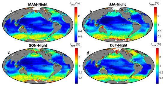 The seasonal distributions in CALIOP’s total ocean depolarization ratio before crosstalk correction (ratio between Equations (5) and (6)) during both nighttime and daytime are shown in Figure 3 and Figure 4, respectively. Data are seasonally averaged climatologies for the 2008–2020 period and binned to 1° latitude × 1° longitude pixels. For comparison, the seasonal distributions of crosstalk corrected total depolarization ratios using Equation (13) are given in Figure 5 and Figure 6 for nighttime and daytime, respectively.