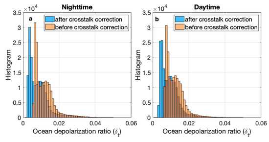 Ocean total depolarization ratio comparisons after (sky blue color) and before (orange color) crosstalk corrections during (a) nighttime and (b) daytime.