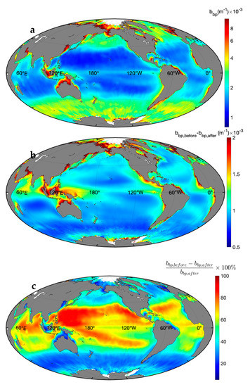 Figure 7 presents the histograms of depolarization ratios before (orange) and after (sky blue) crosstalk correction. These results indicate that the mean relative differences in the depolarization ratios before and after crosstalk correction () are ~55% during nighttime and ~42% during daytime. Figure 8 gives the global distributions of (a) particulate backscattering coefficient bbp (m−1) by Equation (8) after the crosstalk correction, (b) the absolute differences of bbp (bbp, before − bbp, after), and (c) the relative differences between the bbp before and after crosstalk correction (). Figure 8c indicates that over the low-nutrient, low-biomass waters between roughly 40° N and 40° S, the crosstalk-induced errors in the particulate backscattering coefficient bbp before crosstalk correction are very high and can be as large as 100%. As a result, using CALIOP crosstalk-corrected signals is highly recommended for all ocean subsurface studies.