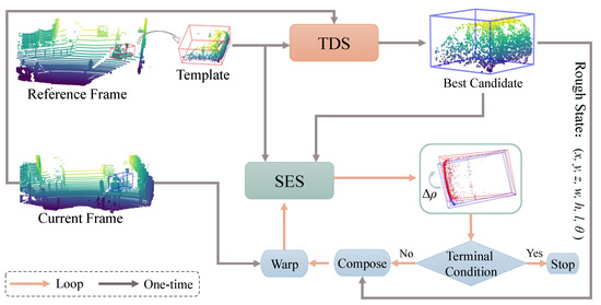 Overview of the proposed method for 3D point cloud tracking. During online tracking, the TDS first provides a rough state of the best candidate. Afterwards, provided with the template from the reference frame, the SES produces the incremental warp of the rough state. It is implemented iteratively until the terminal condition () is satisfied. The state estimation subnetwork (SES) and the target determination subnetwork (TDS) are separately trained using the KITTI tracking dataset.