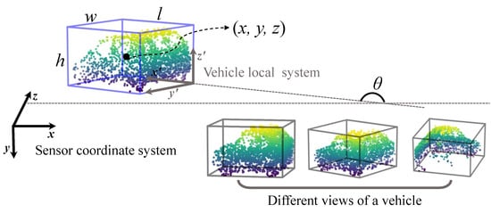 Compared with 2D visual tracking, 3D point cloud tracking has an unstructured data representation and high-dimensional search space for state parameters. Let denote the template point cloud. denotes the source point cloud in the tracked frames, which is extracted by a bounding box with inaccurate center and orientation. Note that we set the quantities of both and to N, and when their totals of points are less than N, we repeat sampling from existing points. In this work, we treat the deep network as a learnable “image” function. In light of this, the template point cloud and the source point cloud can obtain their descriptors using the network after transforming them into the canonical coordinate system. In addition, we regard the rigid transformation between and as the “warp” function. In this way, we can apply the philosophy of IC-LK to the 3D point cloud tracking problem. In practice, the 3D bounding box is usually utilized to represent the target state which can be parametrized by in the LiDAR system, as shown in Figure 2. Therein, is the target center coordinate, represents the target size, and is the rotation angle around the y-axis. Due to the target size remaining almost unchanged in 3D spatial space, it is sufficient to focus only on the state variations in the angle and x, y, and z axes. Consequently, the transformation G will be represented by four warping parameters . More concretely, it can be simplified as follows: