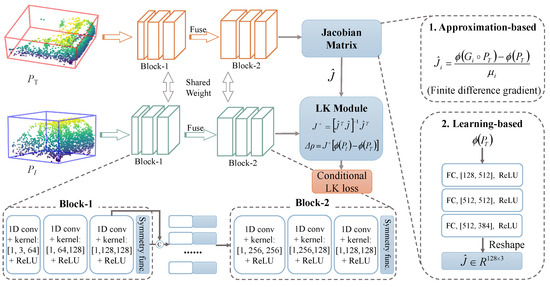 Many tasks involve the estimation of the Jacobian matrix. As we know, the visual servoing field [42,43] usually relies on approximating the inverse Jacobian to control an agent favorably. In addition, for facial image alignment, Xiong et al. [44] proposed a supervised descent method (SDM), which avoids the calculation of the Jacobian and Hessian matrices with a sequence of learned descent directions based on hand-crafted feature. Lin et al. [45] proposed the conditional Lucas-Kanade algorithm to improve the SDM. Subsequently, Han et al. [46] dealt with the image-to-image alignment problem by jointly learning the feature representation for each pixel and partial derivatives. In this work, we innovatively estimate the Jacobian of extended LK algorithm in point cloud tracking.