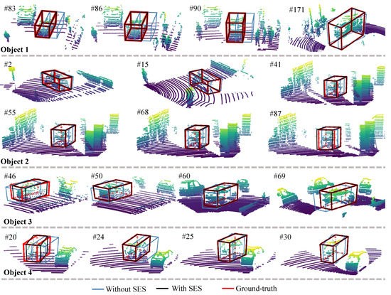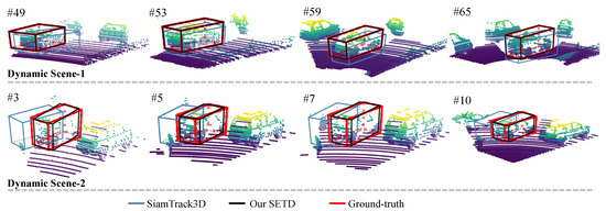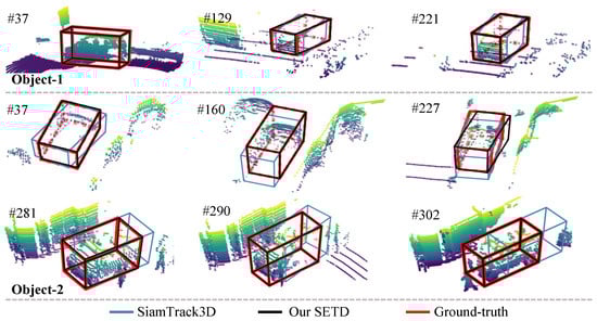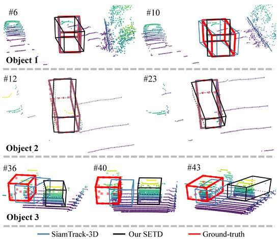 Figure 5 shows a visualization of density variation. As can be seen, “Object-1” changed from dense to sparse, and “Object-2” varied from sparse to dense. For all these scenes, our method tracked the target accurately, whereas SiamTrack3D exhibited skewing. Figure 6 presents some tracking results for dynamic scenes. Generally, the scene is treated as dynamic when the center distance between consecutive frames is larger than [2]. As shown in Figure 6, our method performed better than SiamTrack3D when the target moved quickly, which is attributed to the seamless integration of target discrimination and state estimation. In particular, even though the target was partly occluded and moving at high speed in the scenario presented in the second row, SETD obtained satisfying results, whereas SiamTrack3D produced greatly varying results. Figure 7 plots the tracking results from when the target suffered from different degrees of occlusion. As can be seen, whether the target was visible, partly occluded, or largely occluded, our SETD performed better than SiamTrack3D.