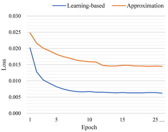 Loss curves during the training phase, where the blue and red curves correspond to the learning-based solution and the approximation-based solution, respectively. Obviously, the former had a low cost and fast convergence.