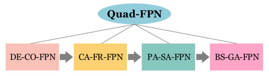Quad-FPN is the basis of classical Faster R-CNN [17] and FPN [22], which are both important solutions to handle mainstream detection tasks. Figure 2 shows Quad-FPN’s overview. Four basic FPNs, i.e., DE-CO-FPN, CA-FR-FPN, PA-SA-FPN, and BS-GA-FPN, constitute its network architecture. Their implementation presents a pipeline that improves SAR ship detection performance progressively.