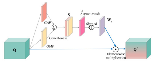 Figure 5 shows the implementation process of PA-SA-Module. In Figure 5, the input feature maps are denoted by Q and the output ones are denoted by Q’. First, a global average pooling (GAP) [29] is used to obtain the average response in space; a global max pooling (GMP) [29] is used to obtain the maximum response in space. Then, their implementation results are concatenated as the synthetic feature maps, denoted by S. Unlike the previous convolutional block attention module [28], we design a space encoder fspace-encode to encode the space information. It is used to represent the spatial correlation. This can improve spatial attention gains because features in the coding space are more concentrated. Then, the output of fspace-encode is activated by a sigmod function to represent each pixel’s importance-level in the original space, i.e., an importance-level weight matrix WS. Finally, an elementwise multiplication is conducted between the original feature maps Q and the importance-level weight matrix WS to obtain the output Q′.