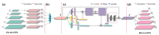 Figure 6d shows the graphical description of the feature pyramid recovery. From Figure 6d, the refined features I′ are resized again through using the similar but reverse procedure of Equation (10) to recover a balanced feature pyramid, i.e.,