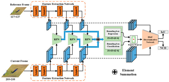 As shown in Figure 1, the single object tracking method proposed in this paper consists of multiple RPNs and a DIoU discriminative network, in which ResNet-50 [19] is used as the backbone network for feature extraction. RPN is constructed under the framework of SNN to perform bounding box regression and classification. The RPNs built on the Block 2, Block 3 and Block 4 of ResNet50 output their own Reg coefficients and Cls scores respectively. They are weighted and then fused through a set of offline learning weight coefficients, obtaining the final Reg coefficients and Cls scores. The foreground with a higher Cls score is selected as the anchor, and the corresponding region proposal is determined by combining the Reg coefficients of the anchor. The convolutional features from multiple layers of ResNet50 are fused. The fused features and the information of the candidate area are input into the DIoU discriminative network, and the region proposal with the best DIoU value is finally determined as the tracking result.