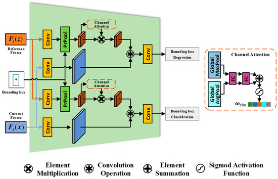 where and are the coordinates of the upper left and lower right corners of the target bounding box respectively, and represents the feature quantity operation on feature after bilinear interpolation operation. The features after channel attention operation are shared by two fully connected layers. The results are element-wise summed. Afer the Sigmoid activation function, the final channel attention weight can be obtained. Furthermore, a convolution operation is performed between the features of the reference frame and those of the current frame. And the result is adjusted by a convolutional layer.