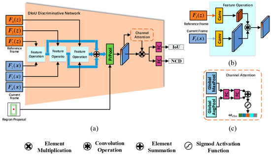 The procedure of the DIoU discriminative network is described as follows. The features of the reference frame and the current frame are first extracted from Block 2 to Block 4 of ResNet50 and fed into the Feature Operation module, in which they are weighted and fused. The fused features are fed into PrPool module together with the region proposal generated by RPN to obtain the features of the region proposal, which are further weighted by the Channel Attention module to enhance their representative capability. And the output features are fed to different prediction branches of FC to obtain IoU and Normalized Center Distance (NCD) [29].