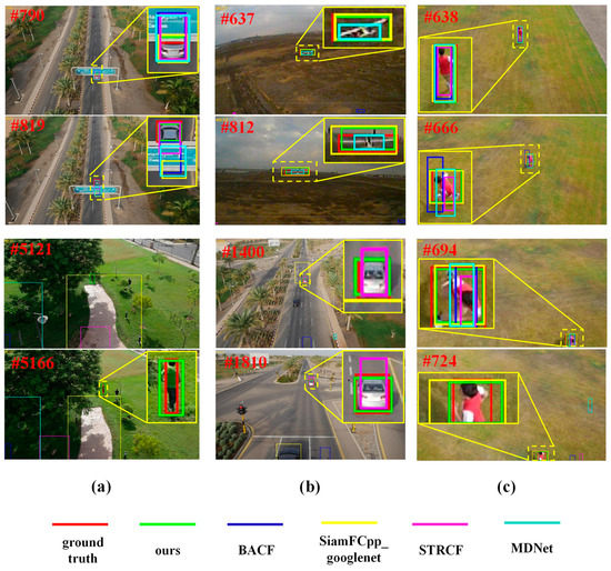 Figure 4a shows the tracking results on car9 and group3 sequences, which involve full occlusion (FOC) and partial occlusion (POC). The tracking results demonstrate that our method can handle occlusions in these sequences well. Although the target is temporarily lost due to the target being completely occluded during tracking, our method can quickly retrieve the target when the target reappears. For example, in the sequence of car9, BACF [42], STRCF [41], and MDNet [21] are blocked by road signs at the 790th and 819th frames and cannot accurately determine the location of the target, while the proposed method produces better tracking results. For the sequence of group3, trees occluded due to the movement of the target and the camera at 5121th and 5166th frames. Other trackers cannot handle the occlusions well, resulting in drift. The proposed method can further optimize the region proposals generated by the channel attention based RPNs, yielding better tracking results.