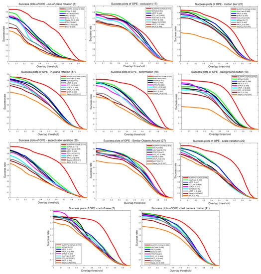 where and represent the intersection and union of two bounding boxes respectively, and represents the number of pixels in the area. Given the overlap score threshold ,, the success rate plot represents the percentage of the frames, which meet , to the total number of frames in the video sequence. In general, the Area Under Curve (AUC) of the success rate plot is used to sort the trackers.