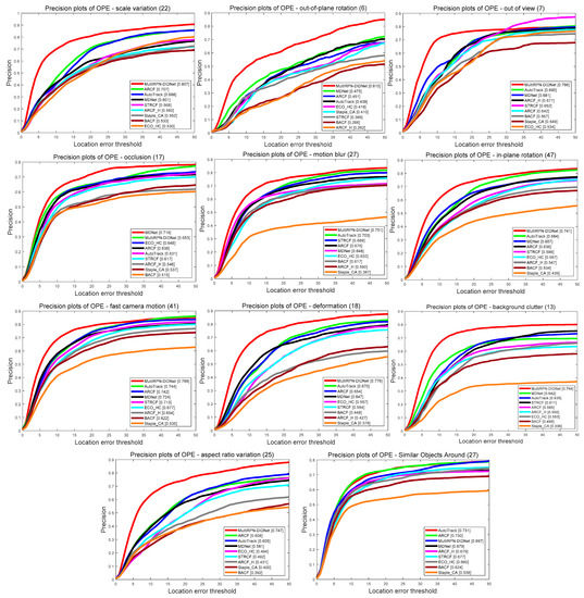 According to different video attributes in the DTB70, we further evaluated the performance of eleven attributes, as shown in Figure 5 and Figure 6.
