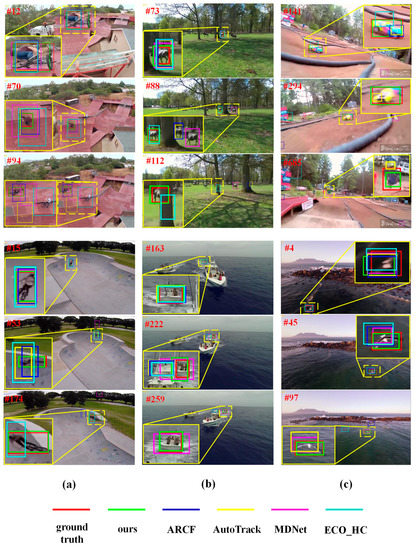 We compared the performance of the proposed method with eight representative trackers on the DTB70 dataset, as shown in Table 7. The eight trackers are AutoTrack [26], ARCF [25], ARCF_H [25], STRCF [41], ECO_HC [40], BACF [42], MDNet [21], and Staple_CA [44].