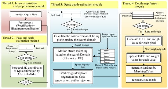 To improve the efficiency and maintainability of the proposed 3D reconstruction system, the framework is divided into several modules by using a multi-processing architecture based on a distributed robot operating system (ROS). The pipeline of our system is shown in Figure 1. It consists of four process modules: image acquisition and pre-processing module, pose and scale estimation module, dense depth estimation module, and global fusion module. Each processing module is assigned to an independent thread.