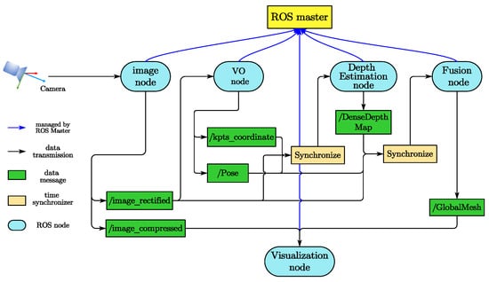 The workflow of ROS-based message passing and synchronizing is shown in Figure 2, which is a peer-to-peer network of processes that are loosely coupled using the ROS communication infrastructure. This framework can balance the computing load in performing communication and messaging passing.