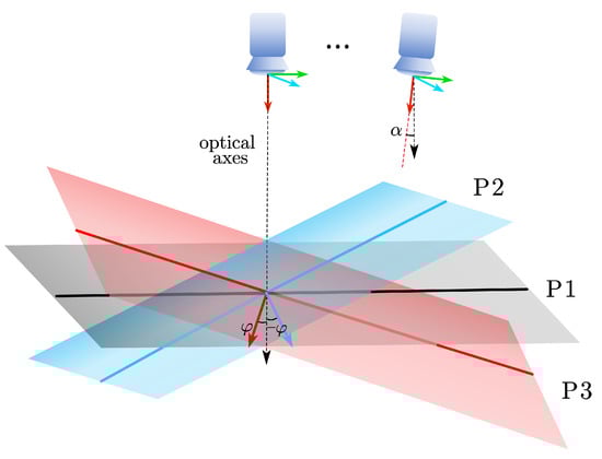 where s and r are the constant scale factor, we set to 0.25 and 0.125, respectively, as a rough indication of the intended overlap between the two images. h is image height, is the optical axis angle deviation from the last KF, and is the angle between optical axes and normal vector of the fitting plane, which will be described later in Section 3.3. The first term in Equation (2) indicates that the cost function penalizes deviations from the desired disparity. Thus, the preferred next KF satisfies the disparity constrain that make the cost minimum, such that the average disparity is approximately equal to . The scene can be classified into three cases according to the scale trends, as demonstrated in Figure 3. When the scene is almost parallel to the camera plane (i.e., the scene P1), φ is close to 0 such that the desired baseline is close to . In other cases (i.e., the scene P2 and P3) the desired baseline of the next keyframe dynamically adjusted according to φ to achieve scale consistency and higher accuracy. In addition, since large rotation of the camera may result in insufficient overlapping, the second term of our cost function takes into account the rotation component. KF baseline becomes longer as the camera rotates or the average depth become smaller.