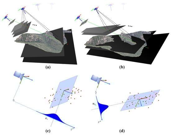 In stereo matching, each selected point in is sampled by Nd depth values, which are uniformly distributed in certain depth space. The sampling depths of all pixels constitute Nd depth searching planes. Those depth values are used as the hypothesis for calculating the matching cost in candidate reference frames one by one. The final value of depth measurement is determined by the minimum matching cost. Since the resolution of depth estimation is decided by the distance between neighboring searching planes, elaborately selecting depth planes is therefore crucial to depth estimation accuracy. A comparison of the selected depth searching plane is demonstrated in Figure 4. Unlike the other methods, which selecting planes parallel to the imaging plane (i.e., (a,c) in Figure 4), our method allows the plane to be selected with significant flexibility by dynamically fitting the spatial distribution of depth.
