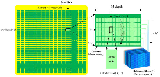 As shown in Figure 6, the current matching image grid is composed of multiple CUDA blocks, and each CUDA block is composed of multiple threads, enumerating depth hypothesis. In each block thread, the matching cost of a pixel patch in all measurement frame is carried out independently for depth hypothesis, which means that a block contains threads. We sum the cost result of different threads for each depth hypothesis and write the results to an array in shared memory, which multiple threads can access. The final optimal depth is determined by the minimum matching cost: