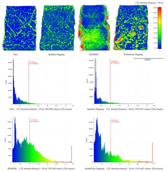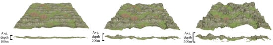 In this section, we presented the results obtained from real-world large scene to prove the usability and efficiency of our system. Since it is difficult to obtain the depth ground-truth of the real large scene, and there is no aerial datasets contain both RGB and depth images of the terrain, we chose to compare with the commercial software, PhotoScan (Agisoft LLC, Russia) [], which is mainly targeted at the accuracy of reconstruction. It usually takes a long time to process and requires high level calculation power hardware. The surface absolute difference among the proposed methods and PhotoScan are obtained for quantitative comparison.