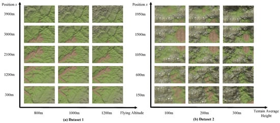 The UAV platform we used in this experiment was equipped with a UHD camera to acquire aerial images at 3840 × 2160 resolution and 30 frames per second. Besides, GPS and IMU values are also recorded, enabling us to classify the data by the approximate ground high and pitch angle (the angle between the optical axis of the camera and the horizontal plane). The UAV has flight several times to acquire aerial images on the region of interest, including town, mountain, and the mixed zone scene. These scenes located in the Jiushangding mountain, Tianjin, covering the area at approximately nine square kilometers. Figure 15 shows examples of satellite images acquired by google earth and aerial images acquired by UAV. These datasets were taken at ground heights ranging from 400 m to 1000 m in different pitch angle. Before feeding the sequences to our system, we resized all images to 960 × 540 resolution for the balance between run-time and accuracy. Detailed statistics are as shown in Table 3.