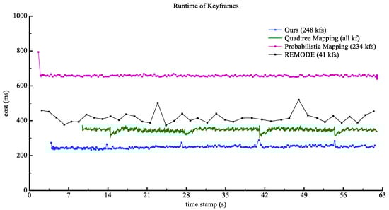 Probabilistic-mapping does not a have keyframe selection module, and it achieves real-time performance by abandoning presets number of the frame. Quadtree-mapping transfers the depth of each frame and iteratively updates it, enabling the system to generate dense depth for every input image in the tracking model. Hence, the run time is relatively long. The average cost and the average density rate of the depth map are shown in Table 2, and our method generates depth maps in a shorter time without losing much of the density rate.