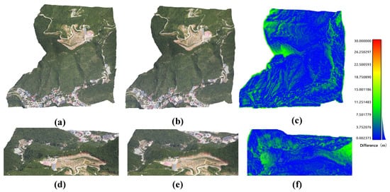 The image sequence data is Mixed Zone-2 in Table 3. Reconstruction results compared with Photoscan. (a,d) are the top view and the front view of the model generated by Photoscan offline. (b,e) are the corresponding results generated by our real-time approach. (c,f) are the difference pseudo-color image.