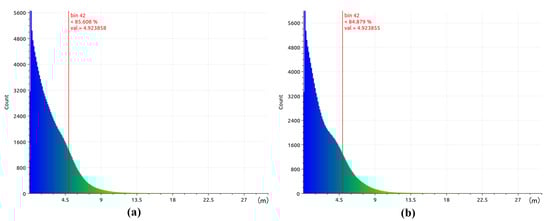 The histogram statistics of the different methods on the data of Mountains-2 (a) and Mixed Zone-2 (b).