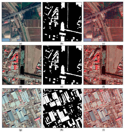 To validate the proposed approach, three scenes of high spatial resolution images were chosen. The three scenes were all captured by a remote sensing satellite, QuickBird, with three spectral bands (red, green, and blue) and 0.6-meter spatial resolution. Figure 5a,d,g present the dataset. The three images are represented by T1, T2, and T3. Central geographic coordinates for T1, T2, and T3 were (115°54′38″ E, 38°25′59″ N), (116°16′14″ E, 38°43′17″ N), and (117°4′7″ E, 38°48′49″ N). Image sizes for the three scenes were 1000 × 1000 pixels. T1 and T2 were of a rural landscape, which covers farmland, woodland, and scattered buildings. T3 captured a well-developed industrial landscape with many warehouses and workshops. These three images were sufficient for validating the proposed approach.