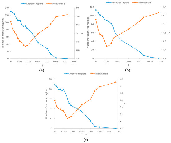 Analytical results of core parameter T are shown in Figure 6. Figure 6a–c correspond to the analytical results of experimental images T1, T2, and T3 respectively. With the increase in T, the number of anchored regions (NAR) of the three experimental images showed a downward trend, and the general tendency of of the three experimental images was to decrease and then rise. A smaller means higher segmentation quality. The change in the NAR and the can be divided into three stages: