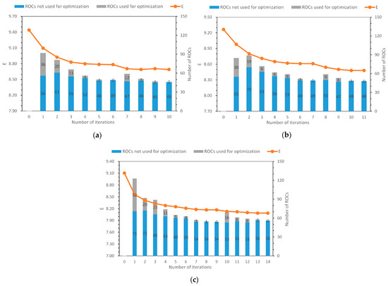 To further analyze the proposed method, the change in indicator E and the use of ROCs during the iteration process are shown in Figure 8. With optimal parameter T, the used ROCs for optimization accounted for a small part of total ROCs. In the preliminary experiment, the optimization effect of the third and more RMC is negligible, so these three experiments all chose two RMC to form the RMCG on the basis of the optimal result criteria. The MC used in the experiment are shown in Table 5, and their details are shown in Section 2.2. represents the RMC that was used in the optimization of experimental image . The number of ROCs used in an iteration was 0, which indicates that the optimization based on the RMC was completed. Other unsupervised evaluation algorithms were not used because they contribute little to objective evaluation. A more objective supervised-evaluation algorithm is used to evaluate the optimization effect in the next section.