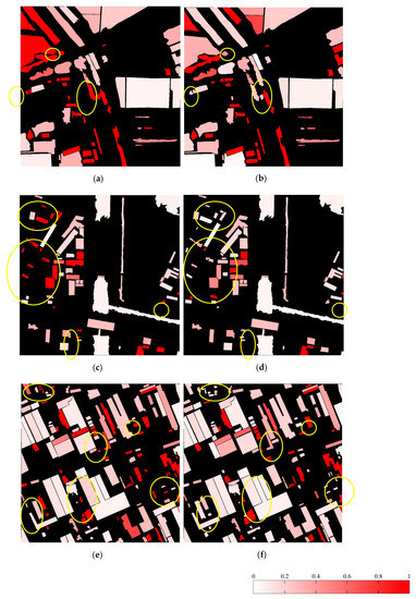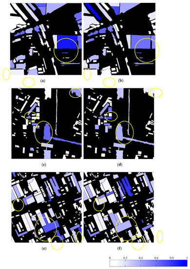 As shown in Table 6, after optimization, the GOSE/GUSE of all experimental images was reduced, indicating that the proposed method could effectively globally reduce over-/under-segmentation error. The decline in GUSE of T1 and T2 was significantly greater than that of GOSE. Although the decline in GUSE of T3 was similar to that of GOSE, Figure 11e,f show that a large number of small-area USE of RG has been corrected.