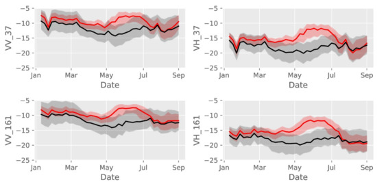 40], the authors recommend using VH/VV to separate maize, soybean, and sunflower, which could be applied to other crop types. This quantity is also considered as a variable sensitive to crop growth in several other studies [