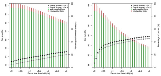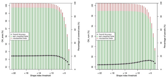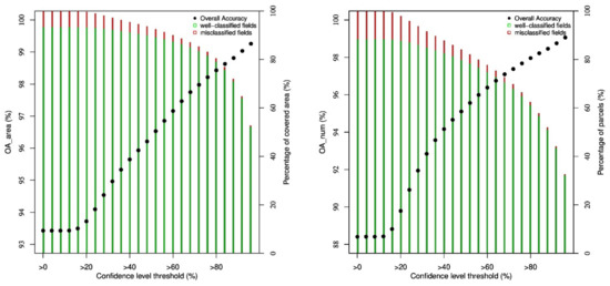 The validation dataset is used to compute two overall performance scores for the RF: OAnum, the overall accuracy based on the number of parcels (percentage of well-classified parcels compared to the total number of parcels), and OAarea, the overall accuracy based on the area (percentage of well-classified hectares).