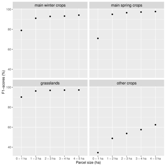Table 2) are considered as misclassified in the validation set. However, this has a negligeable effect on the scores since they represent 0.007% of the parcels (0.0001% in terms of area).
