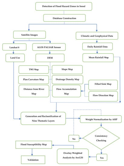 In this study, the ALOS PALSAR (Phased Array type L-band Synthetic Aperture Radar) sensor was used to derive digital elevation model (DEM) with 12.5 resolution. Regarding this issue, the DEM was downloaded from the website https://search.asf.alaska.edu (accessed date: 20 June 2020). On the other hand, Landsat 8 images (i.e., thematic mapper), with the lowest percentage of cloud cover, were downloaded to generate the land use classification map in ArcGIS using data management tools. By using the DEM as a basic layer, other basic thematic maps (slope, drainage density, topographic wetness index (TWI), flow accumulation, distance from river, and plan curvature) were extracted using ArcGIS. Finally, for interpolation of Landsat 8 images, Erdas Imagine and ArcGIS were used to prepare a land use category map of Seoul, considering google earth images to identify different categories of land use. All above mentioned controlling factors were converted to a raster grid with 12.5 m 12.5 m grid cells for application of the AHP model. The flood susceptibility map was prepared after overlaying thematic layers and validating the consistency of the AHP model. A flowchart of the methodology is presented in Figure 2.