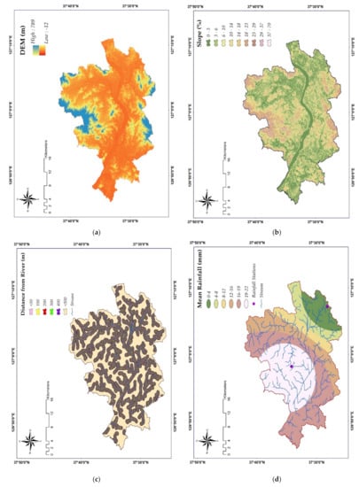 The distance from river is another main controlling factor in flood susceptibility mapping which was prepared using the DEM and streamflow. It is an extracted layer from flow accumulation layer using spatial analyst tools in ArcGIS map was prepared using a buffer tool in ArcGIS and classified into six classes in raster format (Figure 3c). According to this type of map, floods are less likely to occur in areas far away from the water.