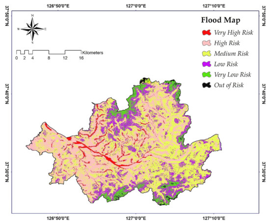 The results revealed that the area was categorized into the following six flood potential zones: very high risk (4%), high risk (36%), medium risk (37%), low risk (16%), very low risk (6%), and out of risk (1%). The area with a very high risk level is concentrated in the central-western part of Seoul, which is characterized by a low elevation and low slope, with high levels of rainfall. Moreover, the small part of the northern and southern parts of Seoul either exhibit very low risk or are out of risk, as the elevation is very high, and the slope exceeds 40°. This area, with a dense cover of forest and vegetation, is at risk of flood occurrence.