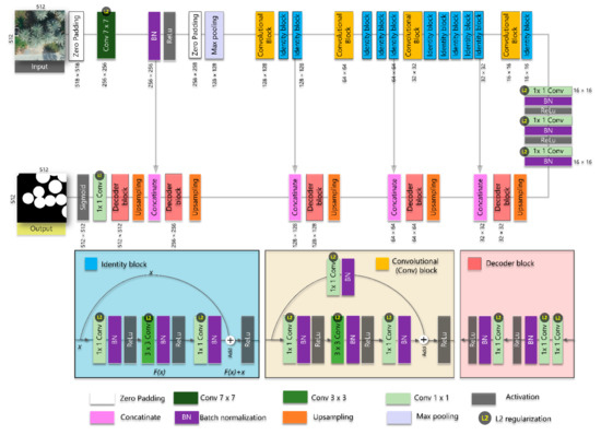 In this study, a deep residual learning network (ResNet) [142] was considered the encoder backbone of the U-Net network for extracting features from input datasets. ResNet, an network architecture that was motivated by the design of Visual Geometry Group network (VGG) [143], was designed to solve the problem of deep gradient explosion and gradient vanishing when the number of layers in the network increases. ResNet architecture encompasses several sets of blocks (i.e., a sequence of convolution, batch normalization, and ReLu) that implement a specific type of connection method, which is referred to as shortcut connection or skip connection. The output feature maps of a particular layer (x) are forwarded and added to a deeper layer (y = F (x) + x). The depth of the ResNet may vary according to the basis of the number of the designed residual layers. ResNet-18, ResNet-50, and ResNet-101 are some common examples of ResNet variations. In this paper, a pertained ResNet-50 based on ImageNet was used as a backbone to increase classification performance and the generalizability of the proposed model. Additional implementation details of the proposed approach are shown in Figure 3 and Table 1.