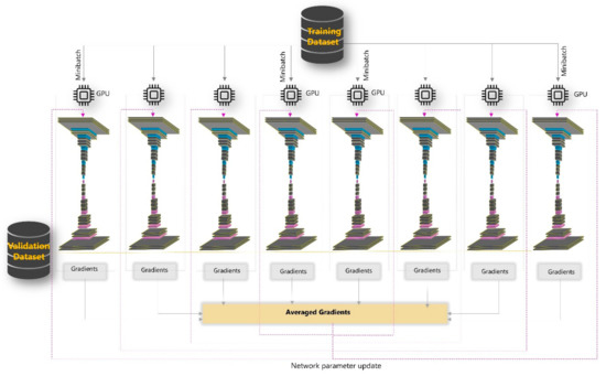 Segmentation models were built using the TensorFlow deep learning framework and executed using multiple graphics processing unit (GPU) hardware. The data parallelism approach using the TensorFlow MirroredStrategy, which enables synchronous distributed training on multiple GPUs in one server, was applied to fit the semantic segmentation models on a Linux cluster, with the following specifications: Intel®, Xeon®, 2.3 GHz, 512 GB of RAM, eight NVIDIATM Tesla K80 (GK210GL) GPUs, and 100 TB of storage. Figure 6 depicts the distributed training strategy used in this study. Eight replicas were created, and each variable in the segmentation model was mirrored across all replicas. The global batch size was set to 32, and the global batch was divided into small minibatches over the eight GPUs. Each GPU independently performed forward and backward parallel passes, and the gradients for the different batches of datasets were computed separately. An independent validation set (2300 image-mask pairs) was used after each training epoch to compute the loss and accuracy of the trained model, thereby avoiding overfitting, and then evaluate its generalizability. Dice loss was computed between outputs of the replicated models and corresponding masks of input image sets as an objective function. The dice coefficient was used to evaluate the segmentation outputs. The gradients of the objective function were gathered and averaged, and an identical update was applied to each independent network.