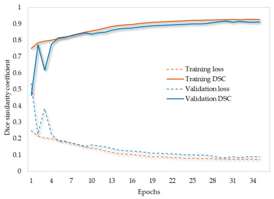 The hyperparameters of all segmentation models were empirically tuned by conducting a set of experiments. The encoder part of all models was initialized using ImageNet pretrained weights, and these weights were fine-tuned with further training. Among the stochastic gradient-based optimization algorithms, the adaptive momentum estimation (ADAM) optimizer [155] was chosen in this study for all FCN networks because of its efficiency in improving convergence and dealing with vanishing learning rates [156]. All segmentation models were trained for 100 epochs by using the ADAM optimizer with an initial learning rate of 0.001 and momentum hyperparameters β1 and β2 of 0.9 and 0.999, respectively. The training process continued until the model converged or until a maximum number of epochs was reached. Various techniques, including early stopping, were used to avoid overfitting. Early stopping was applied to control the training when the performance in the validation dataset degraded over a particular number of consecutive epochs. L2 regularization was also added to all convolutional layers to avoid overfitting.