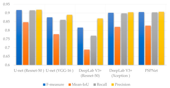 where m denotes the binary ground truth mask, and represents the predicted semantic segmentation. TP, TN, FP, and FN symbolize the numbers of true positive, true negative, false positive, and false negative, respectively.